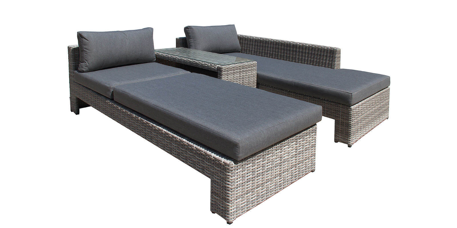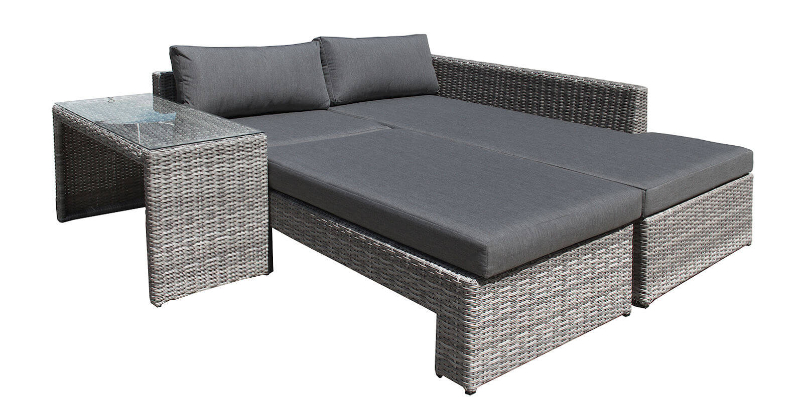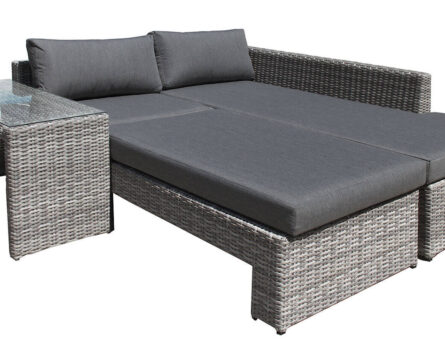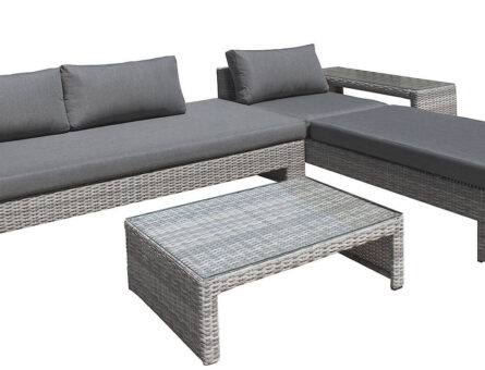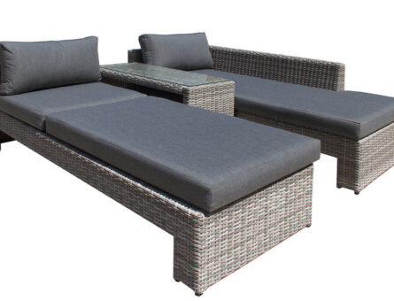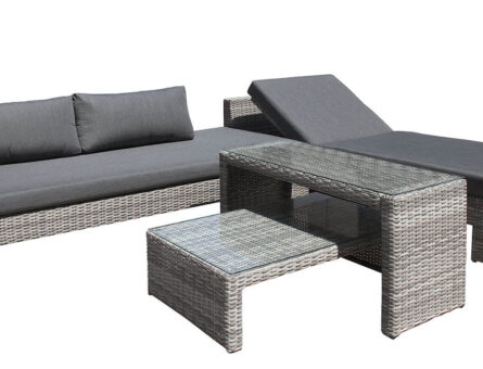 Рады представить этот необычный комплект садовой мебели для отдыха. В его составе широкий диван с приставным столом, роскошный шезлонг с регулируемой спинкой и дополнительный кофейный столик. Благодаря таким компонентам этот набор мебели предоставляет очень много вариантов расстановки для комфортного отдыха на террасе.