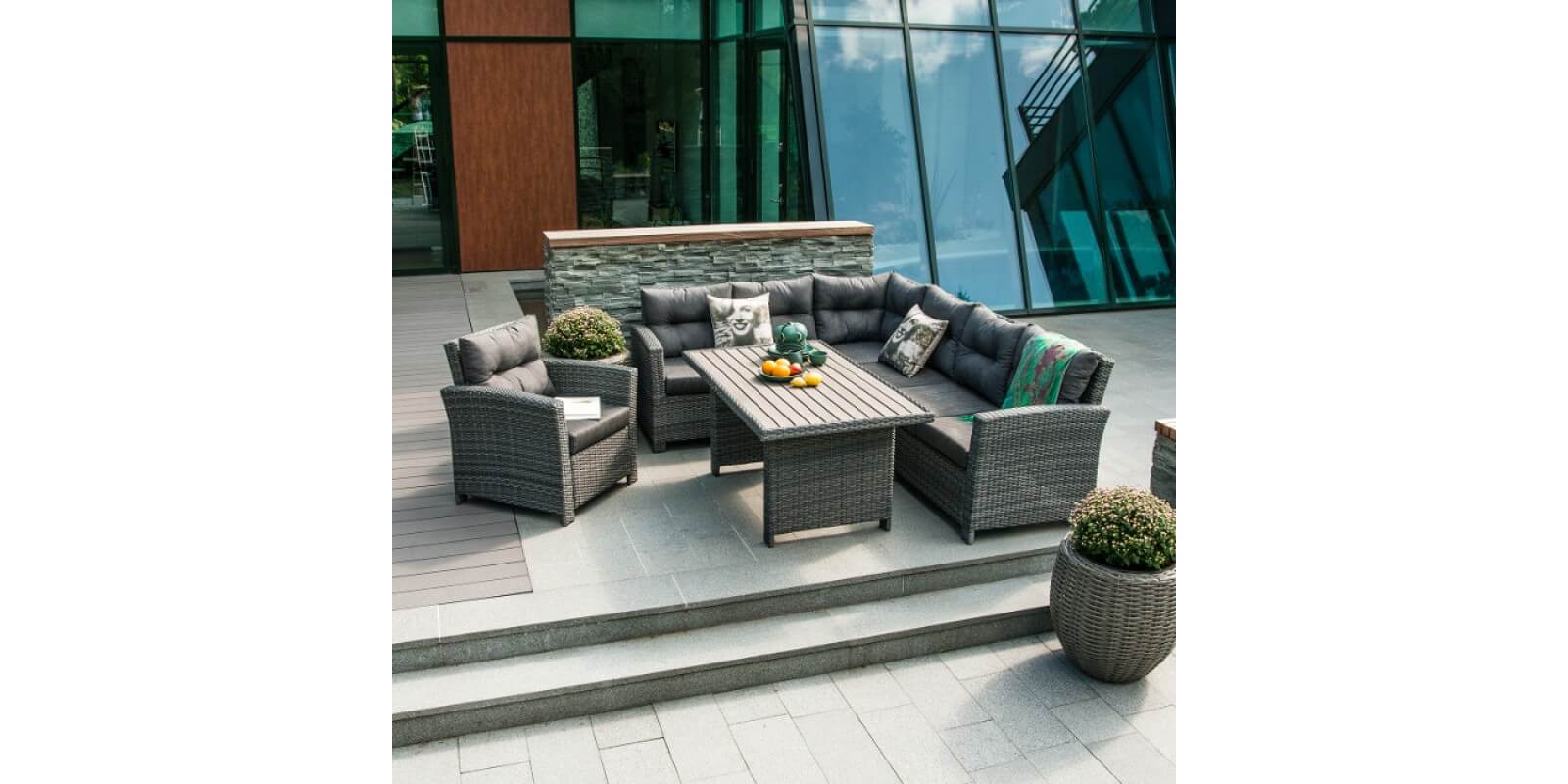 Комплект Pavia с подушками, стол и угловой диван, алюминиевая рама с пластиковым плетением, цвет: тёмно-серый